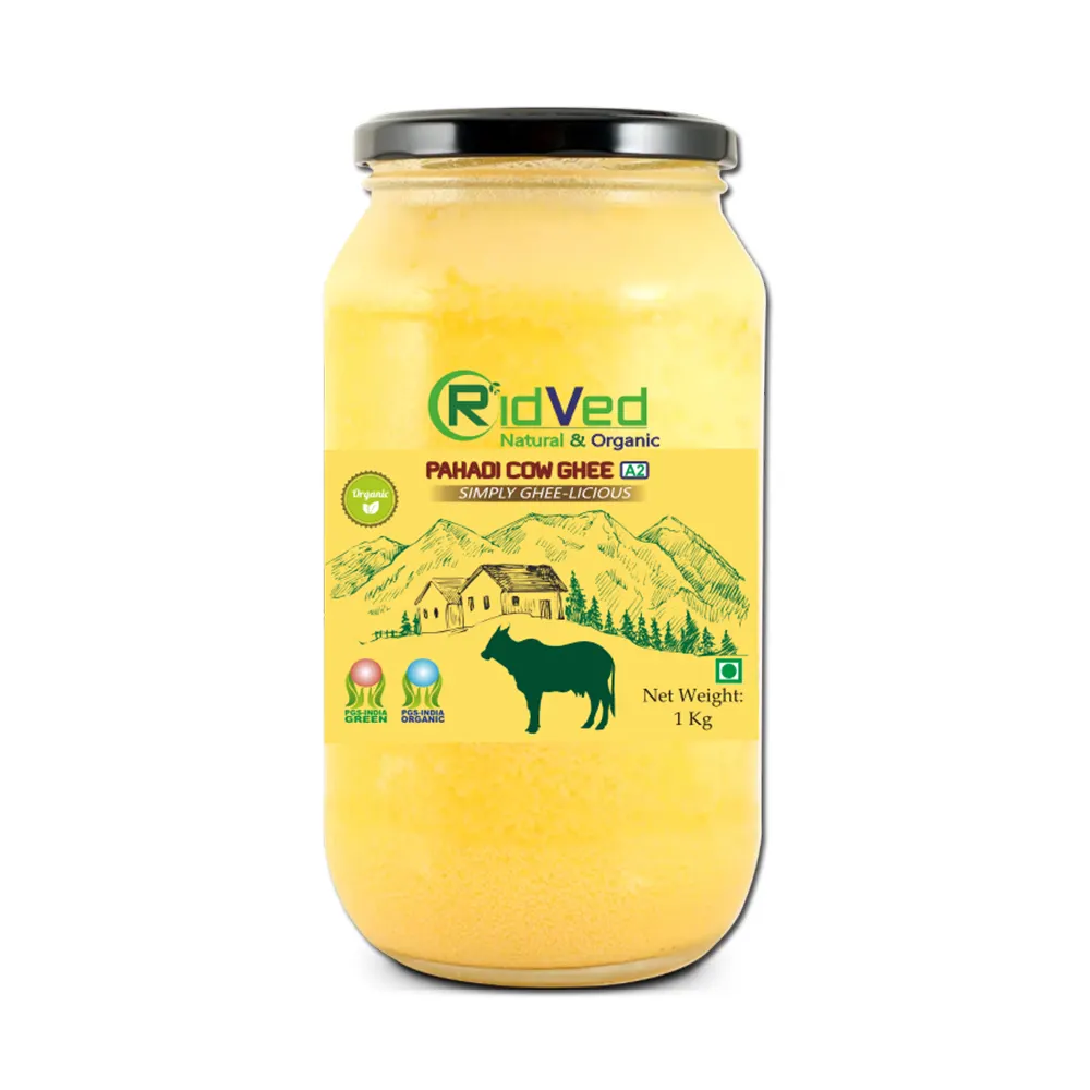 Experience the pure taste and rich aroma of the mountains with RidVed Pahadi Cow Ghee. Sourced from grass-fed Himalayan cows, this ghee is handcrafted using the traditional bilona method to preserve its natural nutrients and authentic flavor.